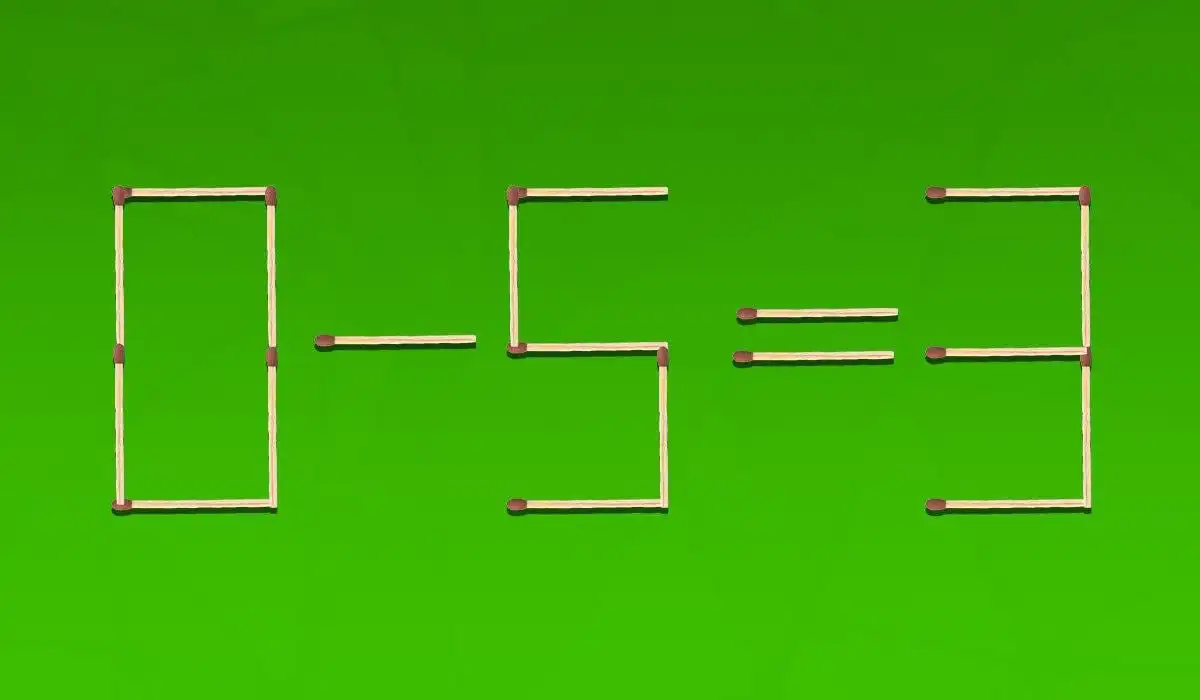 Η εξίσωση 0-5=3 είναι λανθασμένη και πρέπει να γίνει σωστή μετακινώντας ακριβώς δύο σπίρτα. Το κλειδί είναι να σκεφτείτε πώς μπορείτε να αλλάξετε ψηφία και πράξεις, όχι μόνο να διορθώσετε το αποτέλεσμα.