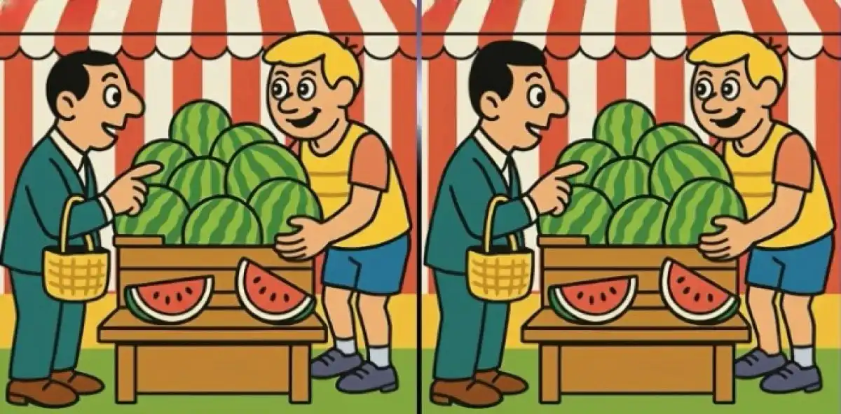Μπροστά σου βρίσκεται ένας κλασικός οπτικός γρίφος: δύο φαινομενικά πανομοιότυπες σκηνές από μια αγορά καρπουζιών. Ο στόχος; Να εντοπίσεις τις τρεις μικρές διαφορές που κρύβονται μέσα σε 27 δευτερόλεπτα. Το κλειδί είναι να εστιάσεις σε λεπτομέρειες που συνήθως περνούν απαρατήρητες.