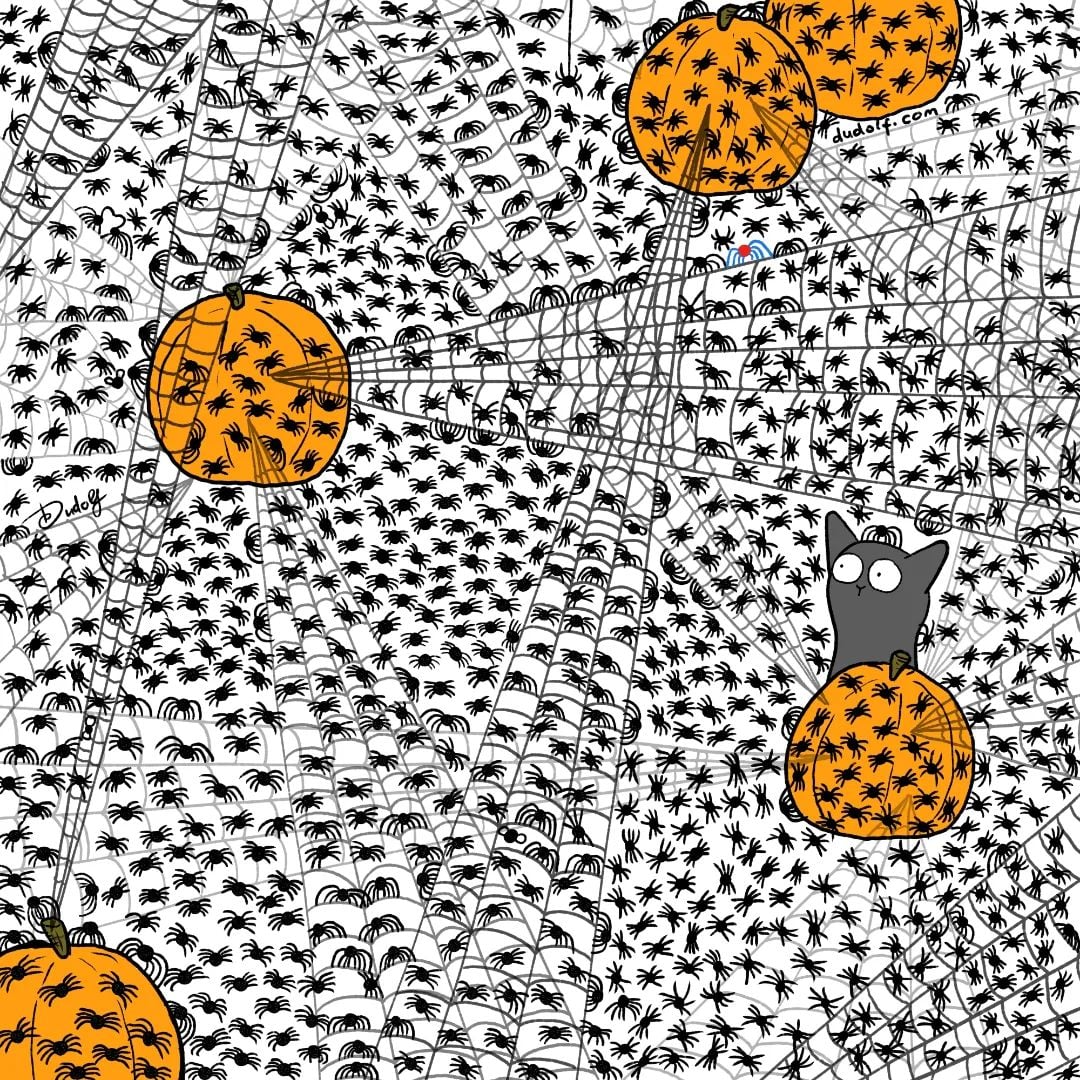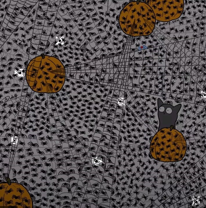 Μια δημοφιλής οπτική δοκιμασία που απαιτεί ακριβή παρατήρηση: βρείτε επτά μύγες κρυμμένες σε έναν ιστό αράχνης γεμάτο κολοκύθες και αράχνες. Το κλειδί είναι να ψάξετε για μικρές διαφορές στη δομή και τα χρώματα.