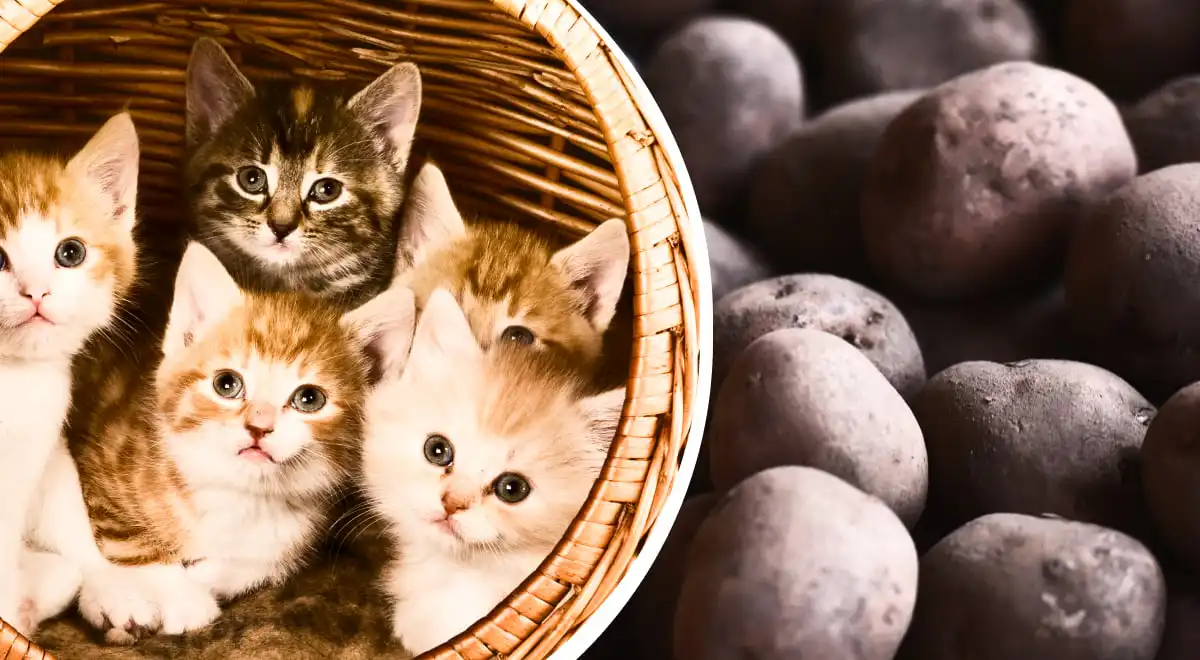 Λύση: Η πατάτα βρίσκεται στο κέντρο-πάνω μέρος της εικόνας. Είναι μεταμφιεσμένη ως το πρόσωπο μιας γάτας! Παρατηρήστε τη γάτα με τα μπλε μάτια ακριβώς πάνω από το κέντρο. Το “πρόσωπό” της δεν έχει μύτη ή στόμα με λεπτομέρειες—έχει τη χαρακτηριστική μορφή και υφή μιας πατάτας με “μάτια” (τις κουκκίδες). Αυτή είναι η κλασική παραπλάνηση όρασης: το μυαλό συμπληρώνει τα γνωστά χαρακτηριστικά γάτας, αλλά εδώ λείπει ένα βασικό στοιχείο, αποκαλύπτοντας το αντικείμενο.