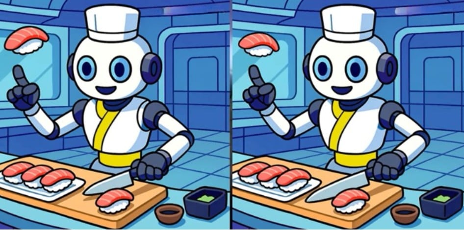 Ένα ρομπότ σούσι σου προκαλεί πρόκληση: δύο φαινομενικά ίδιες εικόνες κρύβουν τρεις μικρές διαφορές. Μπορείς να τις εντοπίσεις σε λιγότερο από 23 δευτερόλεπτα; Το κλειδί είναι να εξετάσεις κάθε στοιχείο ξεχωριστά, από τα μεγάλα χερούλια μέχρι τις μικροσκοπικές λεπτομέρειες στο πιάτο.