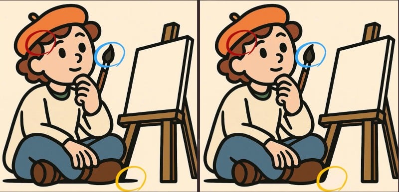 Μπροστά σου βρίσκονται δύο φαινομενικά ίδιες εικόνες ενός ζωγράφου στο στούντιό του. Η πρόκληση; Να εντοπίσεις τις τρεις μικρές, αλλά σημαντικές, διαφορές μεταξύ τους σε λιγότερο από 79 δευτερόλεπτα. Το κλειδί είναι να εστιάσεις στις λεπτομέρειες του περιβάλλοντος και όχι μόνο στο κεντρικό αντικείμενο.