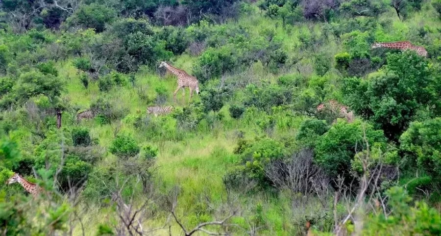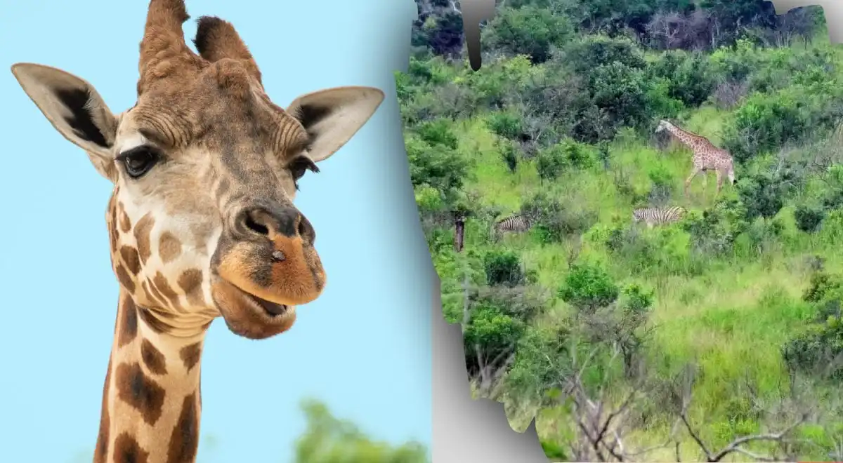 Στην αριστερή πλευρά, βλέπουμε δύο καμηλοπαρδάλεις ξεκάθαρα. Μια τρίτη καμηλοπάρδαλη είναι μερικώς κρυμμένη πίσω από ένα δέντρο στο κέντρο. Στη δεξιά πλευρά, υπάρχουν δύο ζέβρες που στέκονται κοντά η μία στην άλλη. Αλλά κοιτάξτε πιο προσεκτικά: μια τρίτη ζέβρα κρύβεται πίσω από το σώμα μιας από αυτές, με το κεφάλι της να φαίνεται ξεχωριστά. Τέλος, στο πίσω μέρος, δεξιά, υπάρχει μια τέταρτη καμηλοπάρδαλη της οποίας το κεφάλι και ο μακρύς λαιμός διακρίνονται ανάμεσα στα κλαδιά.