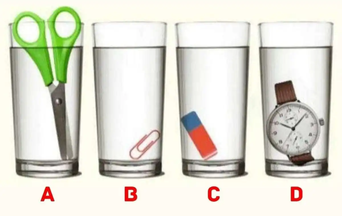 Η λύση: Το ποτήρι με το περισσότερο νερό είναι αυτό που περιέχει τον συνδετήρα. Από όλα τα αντικείμενα, ο μεταλλικός συνδετήρας έχει τον μικρότερο φυσικό όγκο. Είναι συμπαγής, μικρός και καταλαμβάνει ελάχιστο χώρο μέσα στο ποτήρι. Επομένως, εκτοπίζει την μικρότερη ποσότητα νερού, αφήνοντας το υπόλοιπο ποτήρι να περιέχει τη μεγαλύτερη διαθέσιμη ποσότητα υγρού. Το λάστιχο, ακόμα κι αν είναι λυγισμένο, και το ψαλίδι έχουν σαφώς μεγαλύτερο όγκο, «κλέβοντας» περισσότερο χώρο από το νερό.