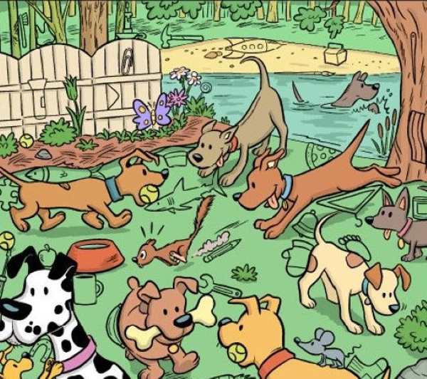 Αυτό το παζλ είναι ένα κλασικό παράδειγμα προκατάληψης προσοχής. Το μυαλό μας τραβάται αυτόματα από τα κύρια, κινούμενα αντικείμενα (τα σκυλιά) και αγνοεί τα μικρά, ακίνητα στοιχεία που δεν περιμένουμε να δούμε σε μια τέτοια σκηνή.