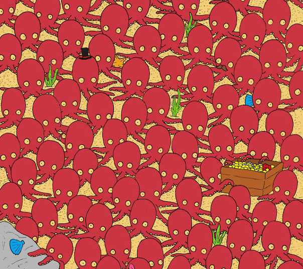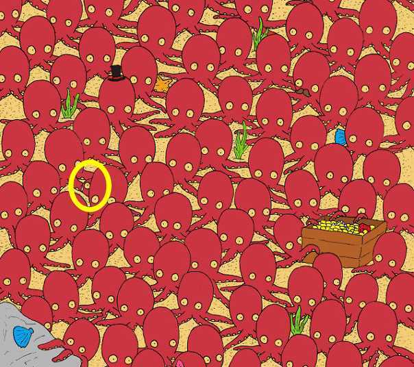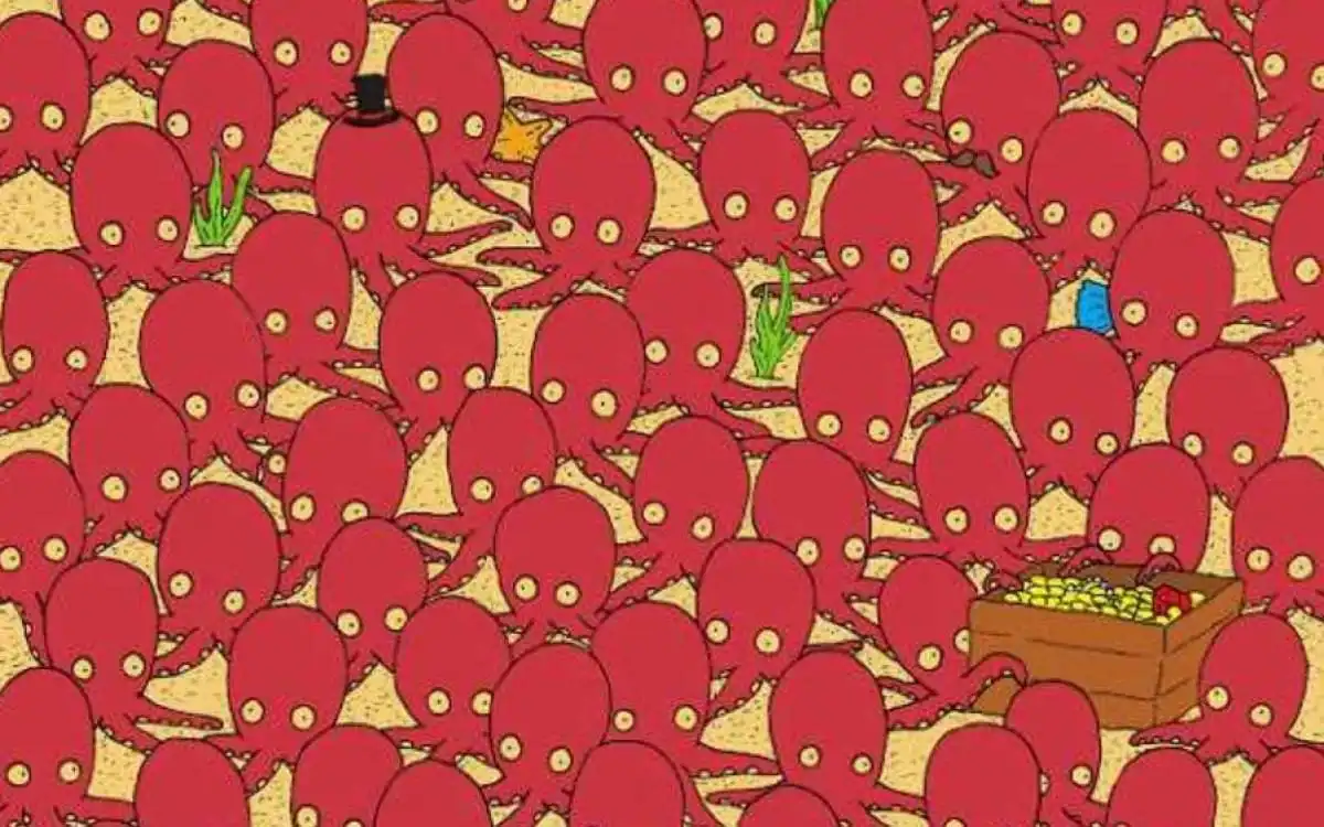 Οι οπτικοί γρίφοι είναι ένας εξαιρετικός τρόπος να διασκεδάσετε και ταυτόχρονα να κρατήσετε το μυαλό σας σε εγρήγορση. Αυτή η συγκεκριμένη εικόνα είναι ένα κλασικό παράδειγμα μιας ψευδαίσθησης που βασίζεται στην ομοιότητα. Βλέπουμε μια σκηνή από τον βυθό της θάλασσας, όπου ένα σμήνος από χταπόδια φαίνεται να έχει ανακαλύψει ένα θησαυρό. Η εικόνα είναι γεμάτη με πλοκάμια, μάτια και στρογγυλά σώματα. Ο στόχος σας είναι απλός, αλλά όχι εύκολος: να βρείτε το μοναδικό ψάρι που κρύβεται ανάμεσά τους. Έχετε μόνο 7 δευτερόλεπτα για να το καταφέρετε. Αυτό το χρονικό όριο δημιουργεί πίεση και αναγκάζει το μυαλό σας να βασιστεί στην πρώτη του εντύπωση και στην ταχύτητα της παρατήρησης. Είστε έτοιμοι;
