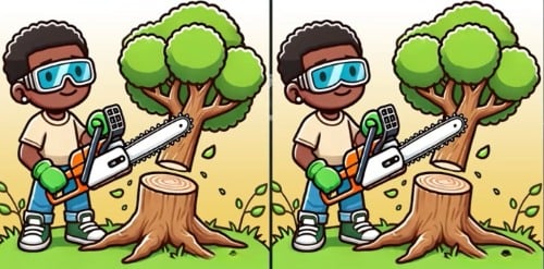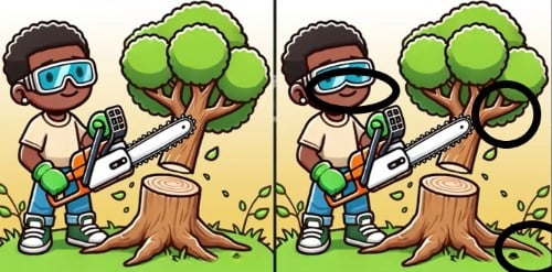 Οι διαφορές βρίσκονται σε σημεία που το μάτι τείνει να παραβλέπει, θεωρώντας τα μέρος του φόντου. Η πρώτη διαφορά είναι στο κλαδί του δέντρου στο πάνω αριστερό μέρος της εικόνας. Στη μία εικόνα λείπει ένα μικρό φύλλο. Η δεύτερη διαφορά αφορά τον ίδιο τον κορμό που κόβει ο ξυλοκόπος: δες προσεκτικά τη γραμμή του σχισίματος, έχει μια μικρή διαφορά στο σχήμα της. Η τρίτη και τελευταία διαφορά βρίσκεται στο χορτάρι στο κάτω μέρος της εικόνας, όπου μια μικρή λωρίδα χλόης αλλάζει θέση ελαφρώς. Η εξέταση κάθε στοιχείου ξεχωριστά είναι το κλειδί.