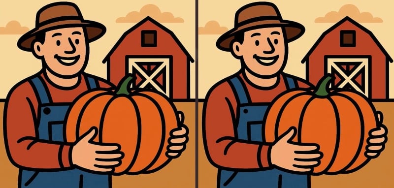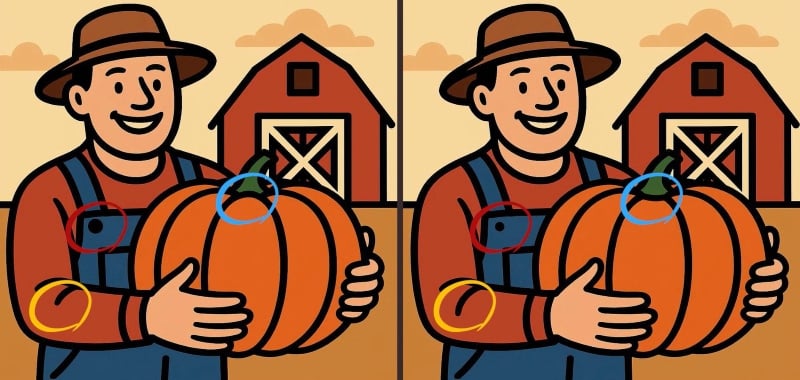 Αυτό το παζλ “Βρες τις 3 διαφορές” με τον αγρότη και την κολοκύθα είναι μια εξαιρετική δοκιμασία για την παρατηρητικότητα και την προσοχή στη λεπτομέρεια. Οι εικόνες φαίνονται πανομοιότυπες, αλλά μικρές αλλαγές κρύβονται σε απροσδόκητα σημεία. Η λύση απαιτεί συστηματική εξέταση.