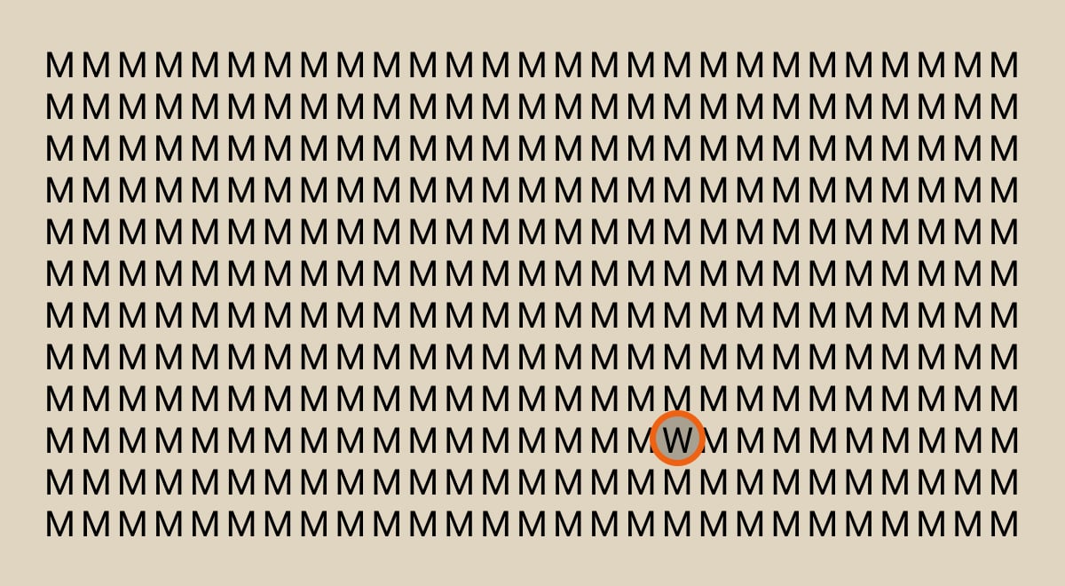 Μια θωρακισμένη σειρά από γράμματα «Μ» κρύβει ένα μοναδικό «W». Η λύση βρίσκεται στο να αλλάξεις τον τρόπο που σαρώνεις την εικόνα, ψάχνοντας για μια μικρή, αλλά κρίσιμη, διαφορά στη γεωμετρία των γραμμάτων.